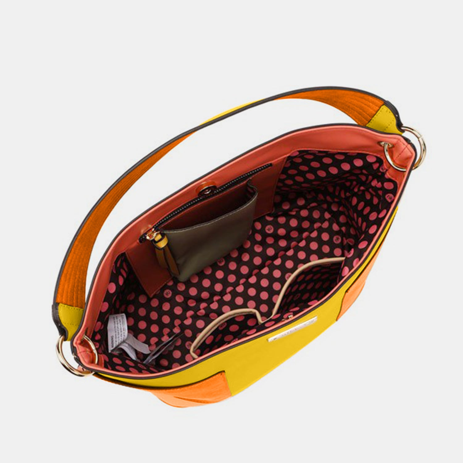 Spacious interior lined with signature Nikky polka dot print polyester fabric.